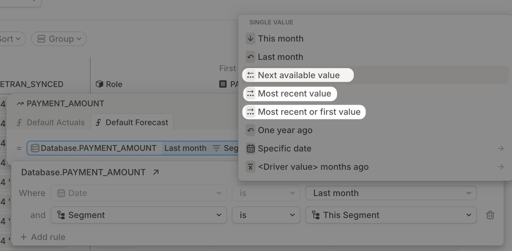 Use these for things like CRM deals (propagate a closed deal’s value forward) or HRIS data (backfill employee start dates). They’re available in both the datashaping UI and the formula editor.
